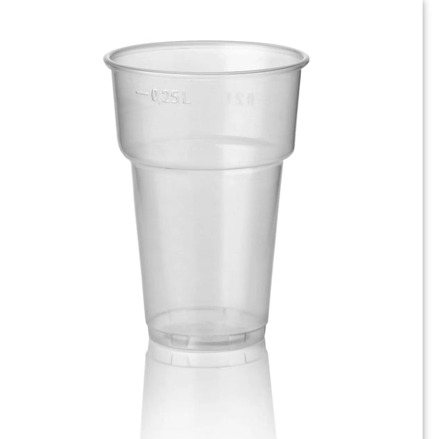 PP bierglas 250cc transparant — splintervrij, stapelbaar en goedgekeurd voor festivals en evenementen. Doos van 1.000 stuks.