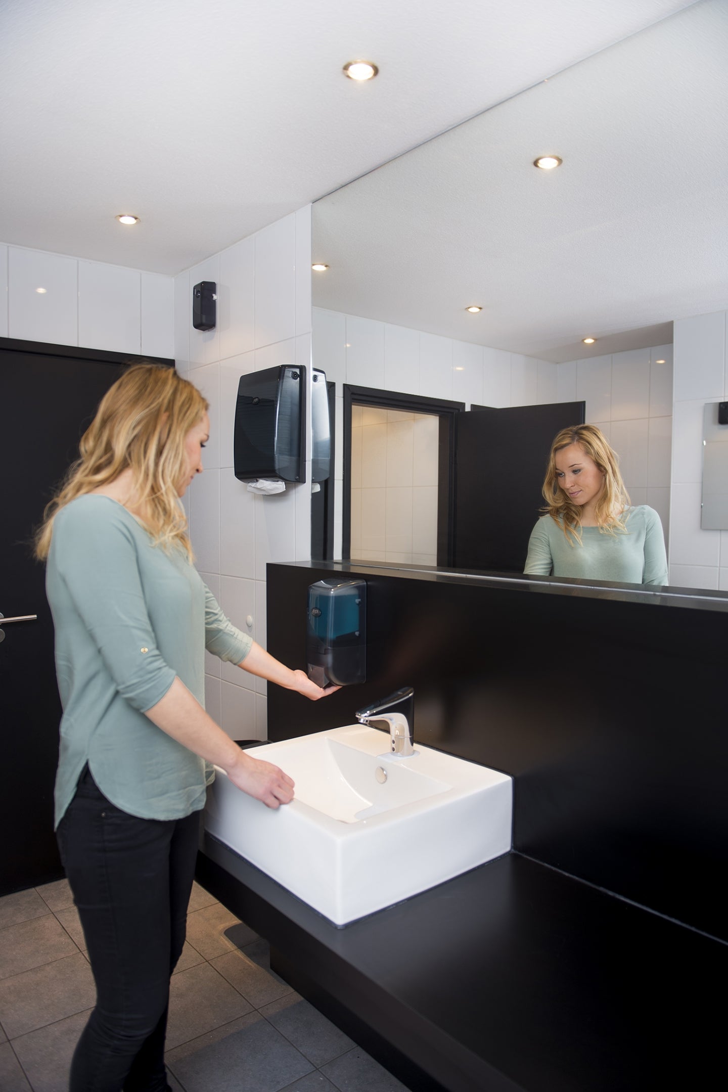 This user-friendly soap dispenser generates measured soap consumption thanks to its simple push-button system. Each refill uses a new dispensing system, making it exceptionally hygienic. The semi-transparent design of the dispenser makes it easy to see how full the bottle is.